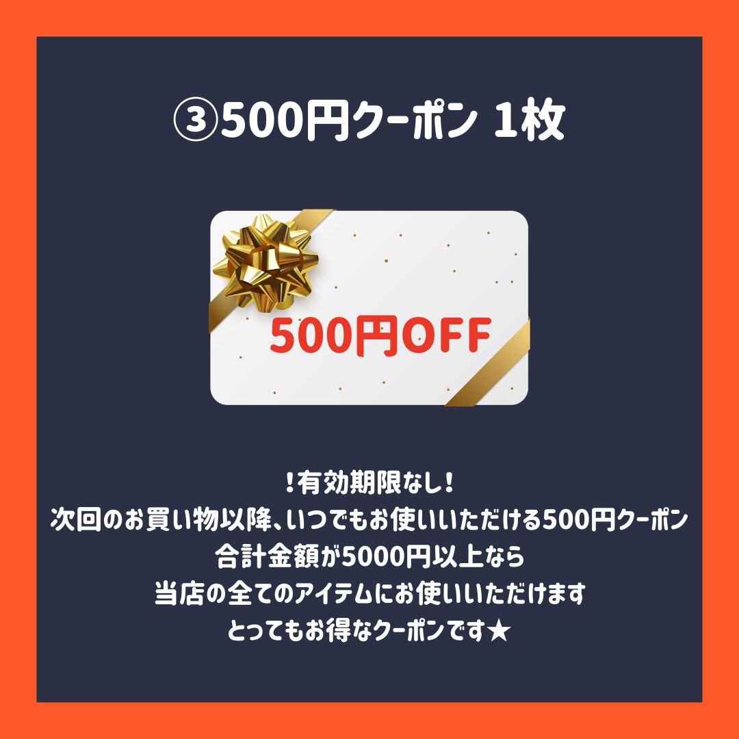 次回のお買い物以降、いつでもお使いいただける500円クーポンが1枚付きます!