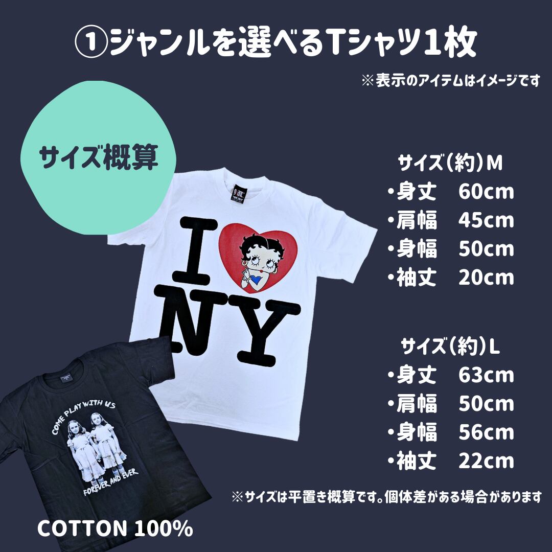 ①のジャンルが選べるTシャツのサイズは、選べるM&Lの2種類展開です: